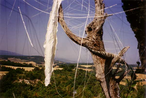 La Pleine, Südfrankreich, Spätsommer 1989: In der Hitze des Morgens sitze ich Tag für Tag eine Woche lang auf einem kleinen Hügel in einem aus der Ferne weit sichtbaren, abgestorbenen Baum. Kein Schatten nirgends. Mit einem dünnen, weißen Seidenfaden spinne ich den Baum ein. Am Spätnachmittag sammle ich blühende Ginsterzweige und umwickle sie mit den weißen Seidenfäden zu einer festen Spindelform. Ich mache aus Seidenpapier mehrere Abdrücke von der Form und webe zwischen die Schichten hauchdünne rote Seidenfäden. Es entsteht ein halbschalenförmiges längliches, weißes Objekt. Zwei weitere Abdrücke füge ich aneinander und forme eine Maske. Zuletzt sitze ich als Larve im Baum und spinne uns ein - bis mir buchstäblich Flügel wachsen. Ich entsteige dem Baum. Die Ginsterspindel und das wie eine leere Hülle anmutende Objekt bleiben zurück. Ich renne über den nahegelegenen, weiträumigen Stoppelacker der untergehenden Sonne entgegen. Mein Schatten auf dem Feld wird länger. Ich werde immer schneller. Der Horizont kommt mir entgegen: "Im Schatten der Sonne". (Sommeratelier PLAYING ARTS)